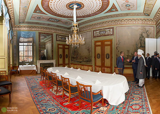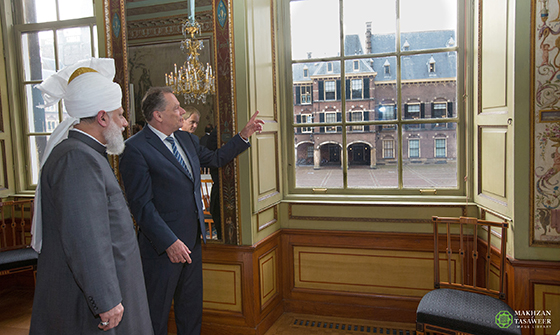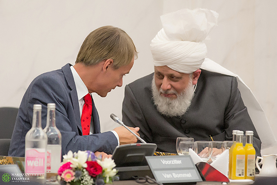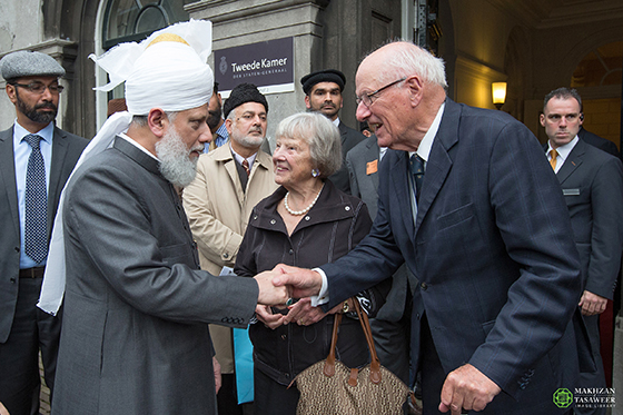 Upon arrival at 4.35pm, Hazrat Mirza Masroor Ahmad was greeted by Harry van Bommel (Member of the House of Representatives and Deputy Chairman of the Standing Committee for Foreign Affairs), who escorted His Holiness to the Committee Room.