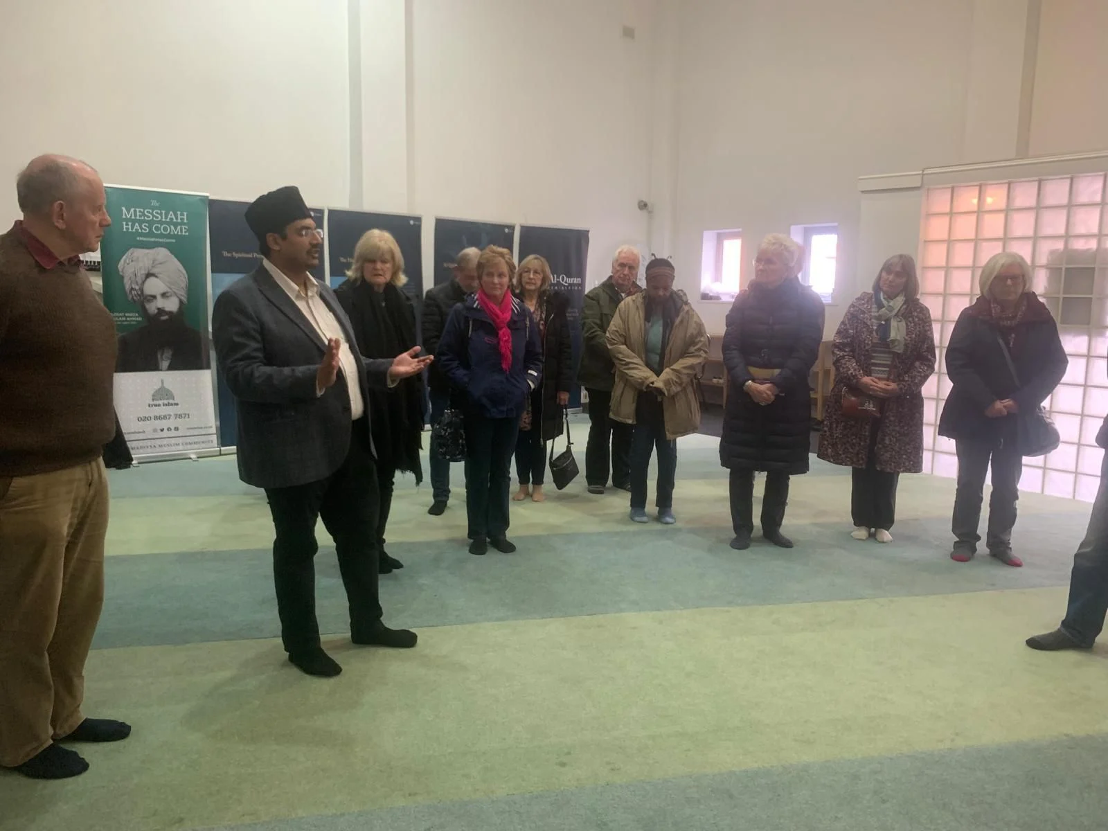 The visit began with a welcome from members of the mosque, followed by a series of presentations introducing guests to the origins and values of the Ahmadiyya Muslim Community. Speakers outlined the Community’s emphasis on peace, service to society, and loyalty to one’s country, as well as its humanitarian initiatives both in the UK and internationally.